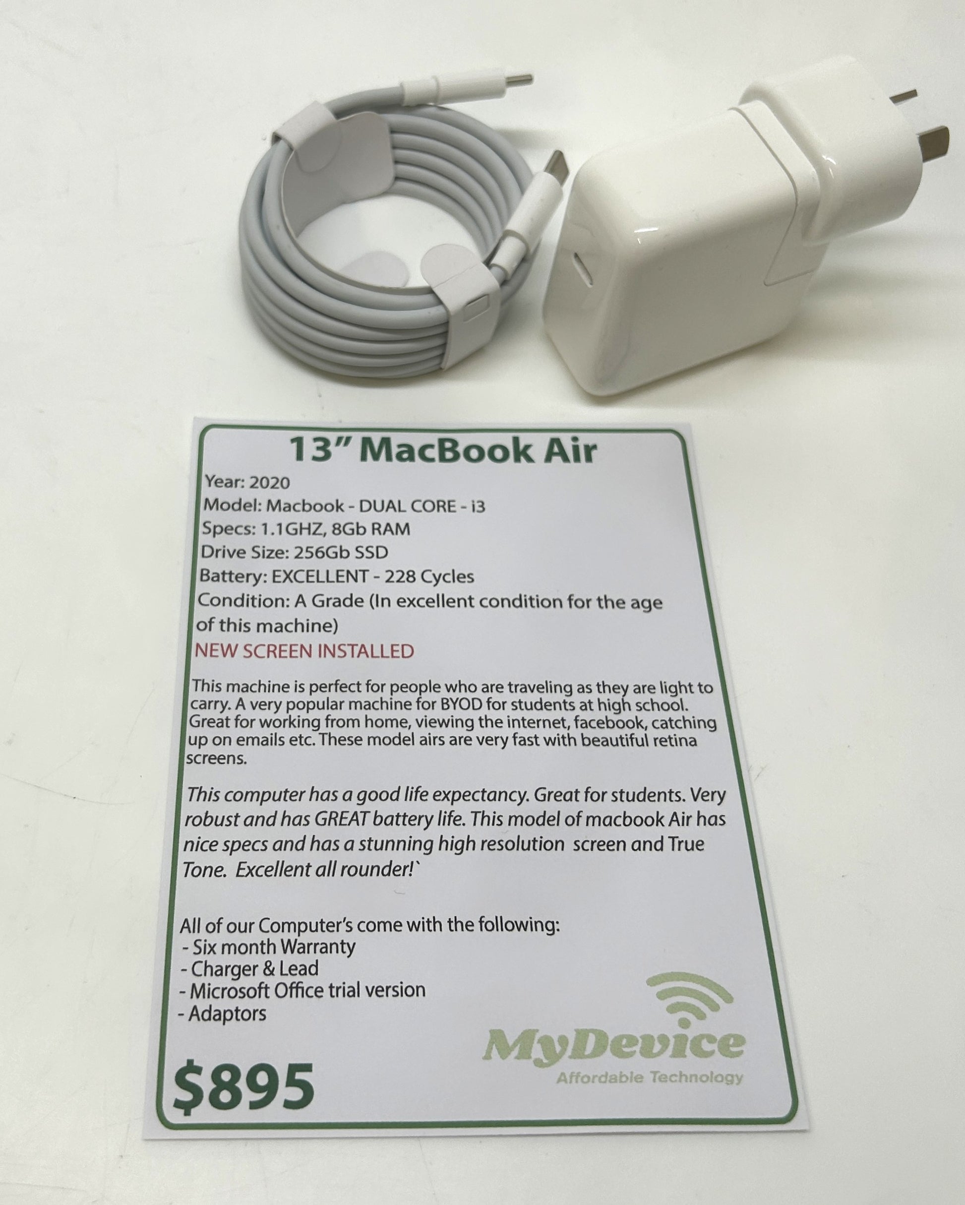 This machine is perfect for those on the go as it's light and portable. Very popular option for those needing a BYOD. These model Airs have a great battery, run nice and fast and have a beautiful Retina screen. Number one option for students and has a great life expectancy as its 2020 and running its latest operating system OS15.7 Sequioa.