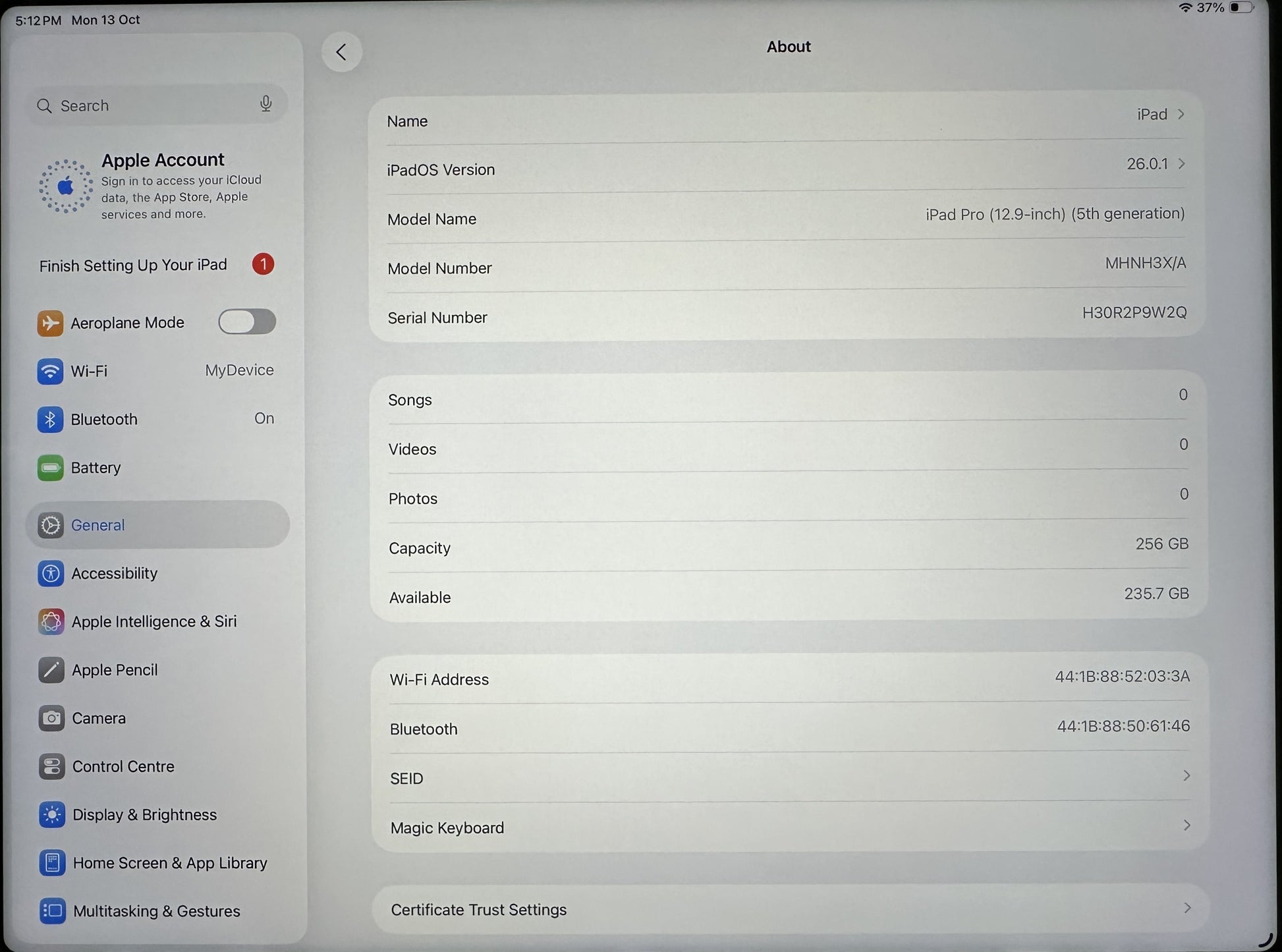 Model: 5th Generation iPad Pro 12.9” M1 3.2Ghz