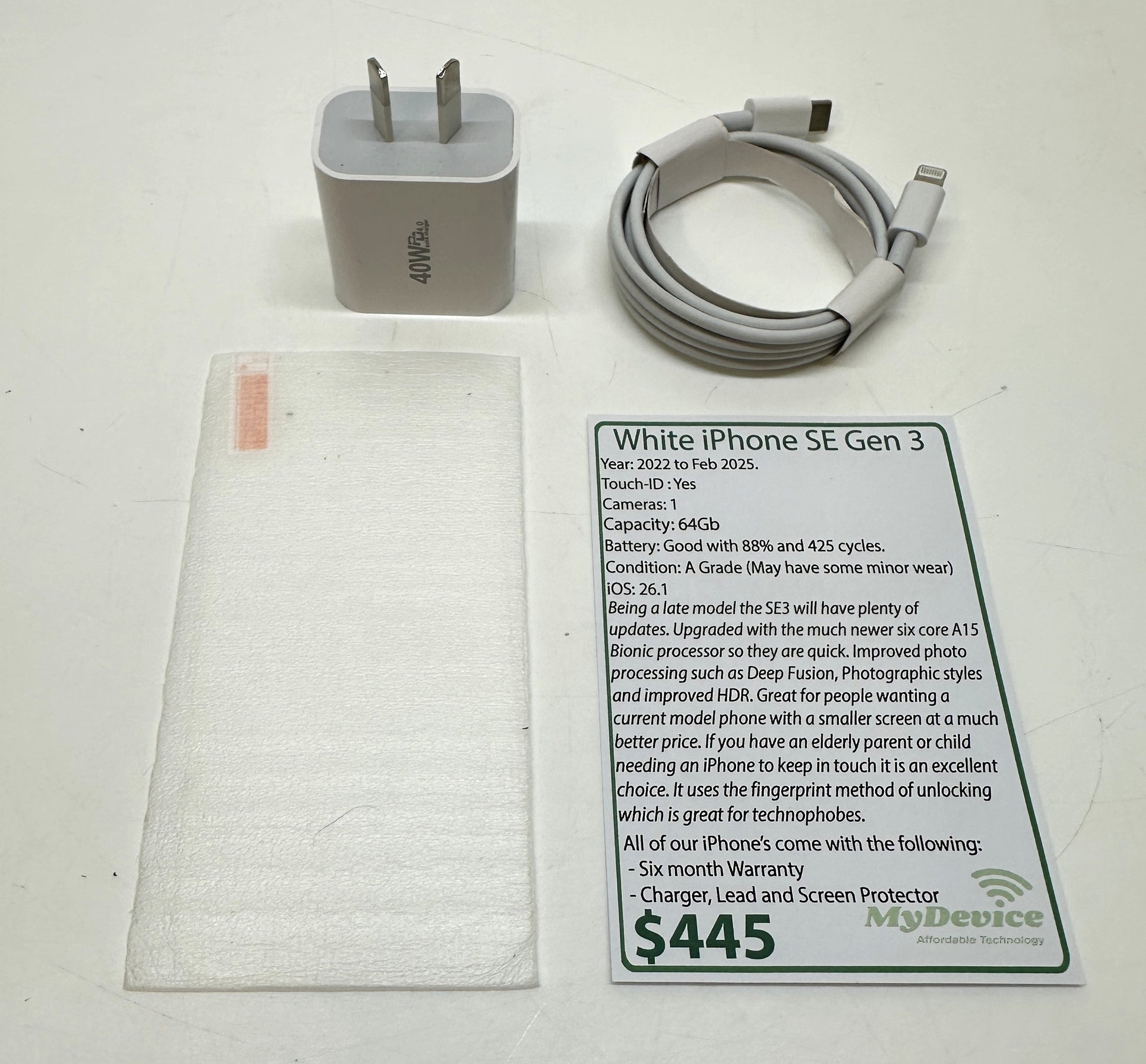 The iPhone SE3 offers big performance with the SIX Core A15 Bionic processor which basically means it is really fast! The screen is a 4.7" (diagonal) widescreen multitouch "True Tone" LED-backlit 1334x750 native resolution "Retina HD" display. Improved photo processing such as Deep Fusion, Photographic styles and improved HDR. The iPhone SE (3rd Gen) uses an "aerospace-grade" aluminum alloy case and has a glass front and back. Apple estimates that the iPhone SE (3rd Gen) provides "up to" 50 hours of audio playback, 15 hours of video playback, and 10 hours of streamed video playback. It supports "wireless" (inductive) charging, too (Qi).