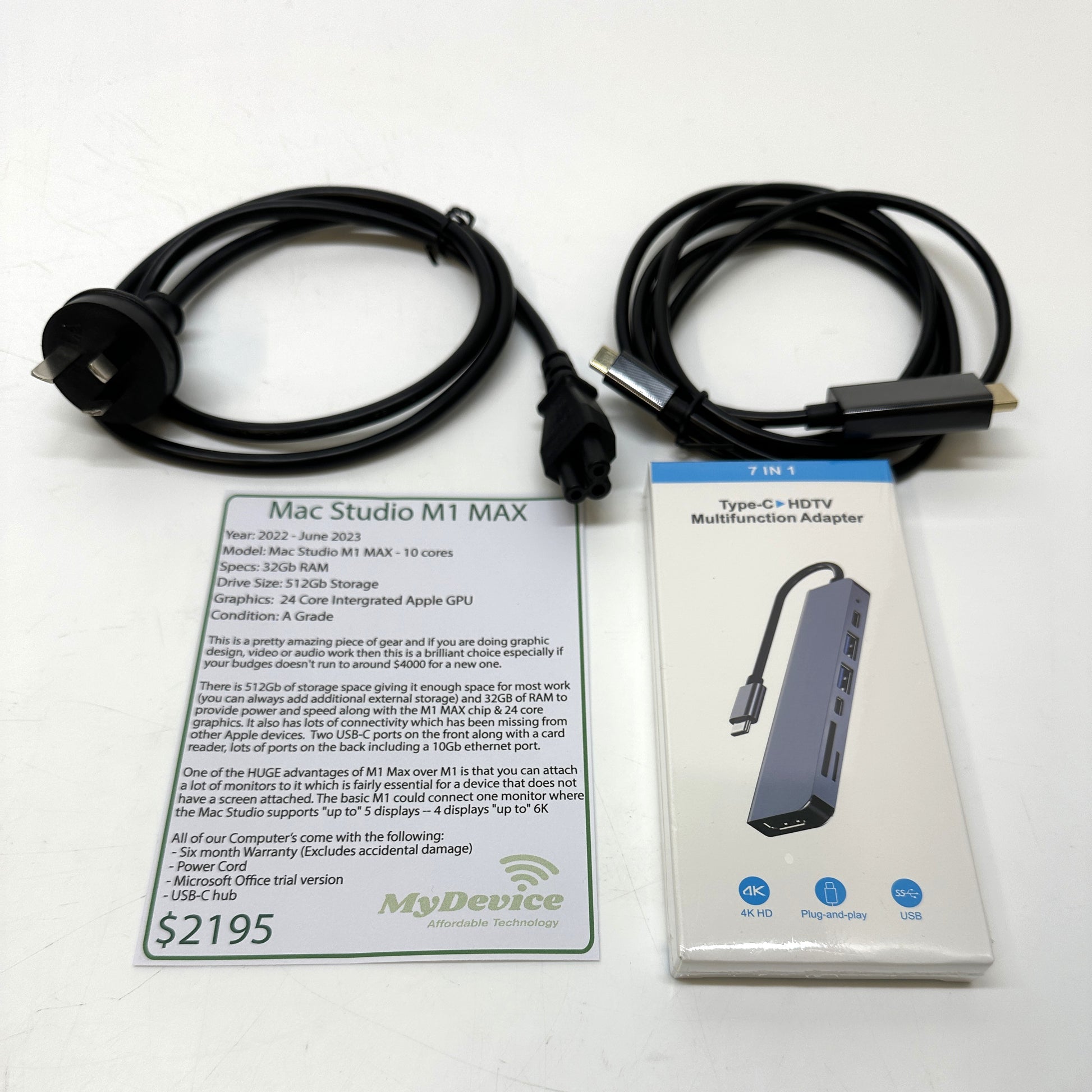 - Power Cord, USB C Hub, Video Out cable (USB-C to HDMI)