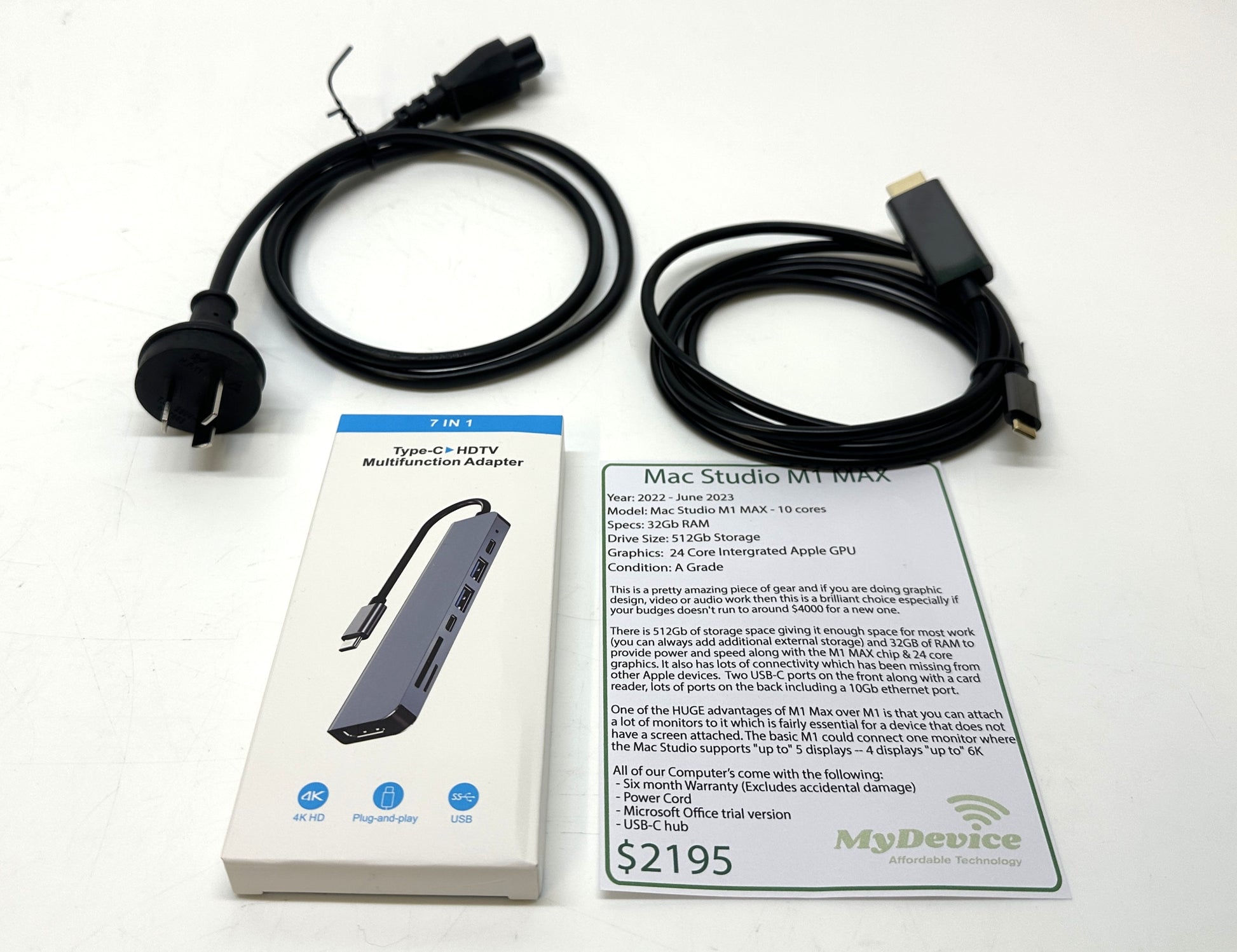 - Power Cord, USB C Hub, Video Out cable (USB-C to HDMI)